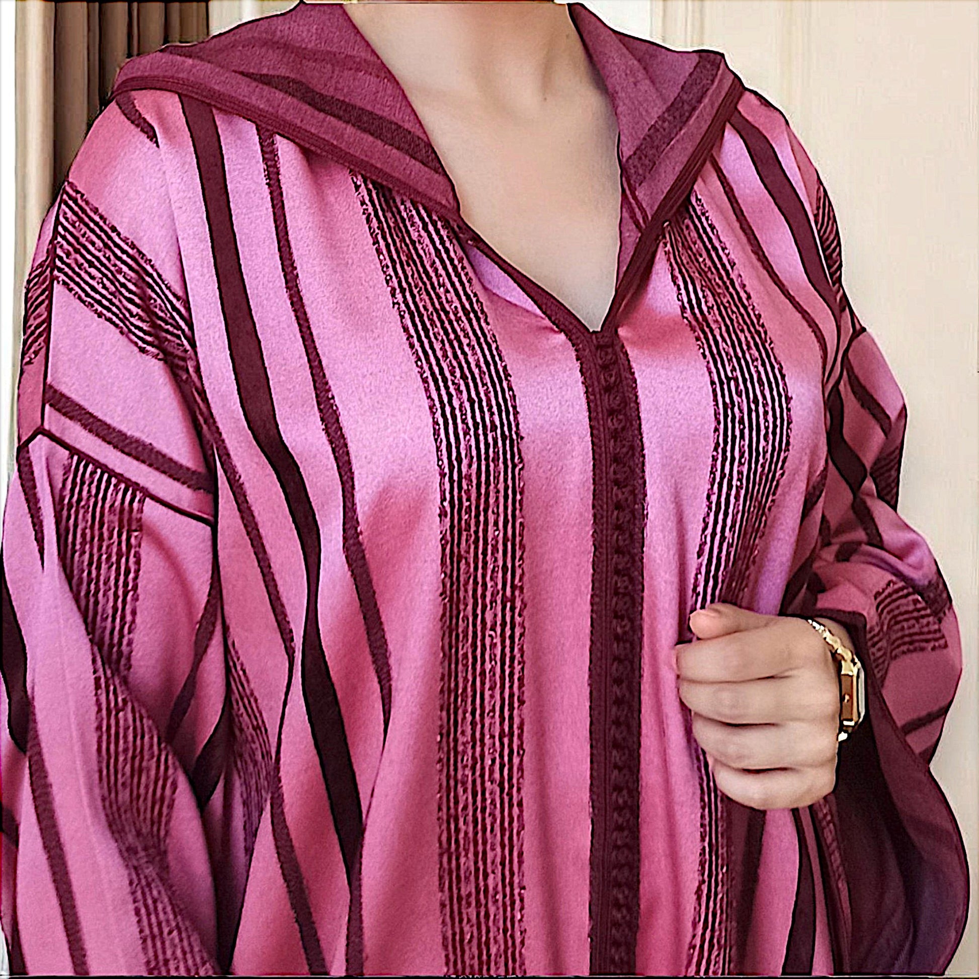 Order on WhatsAppRich berry stripes flow across this radiant piece, where deep pink and plum tones meet in silky harmony. A luminous, feminine classic with a modern edge.