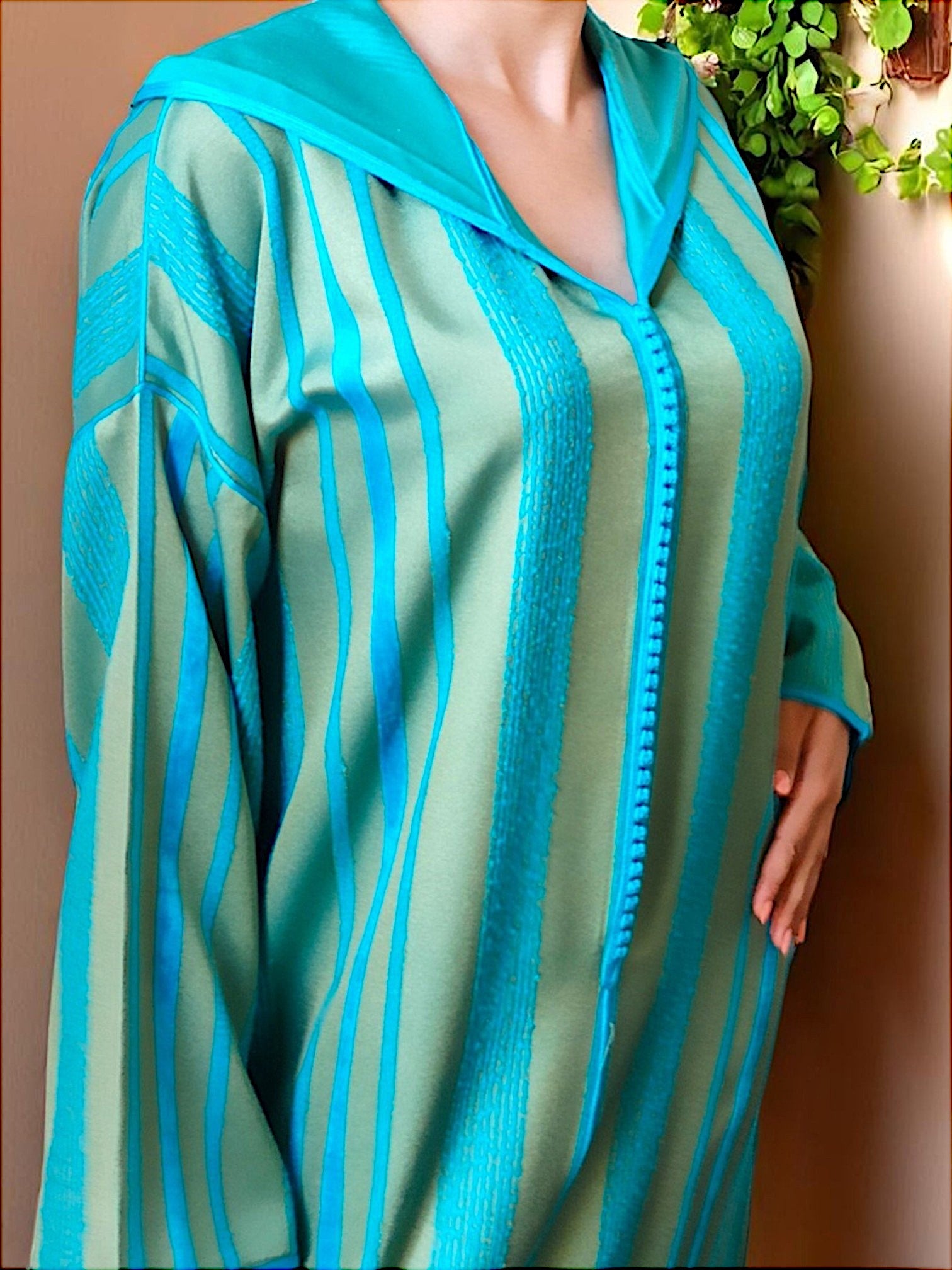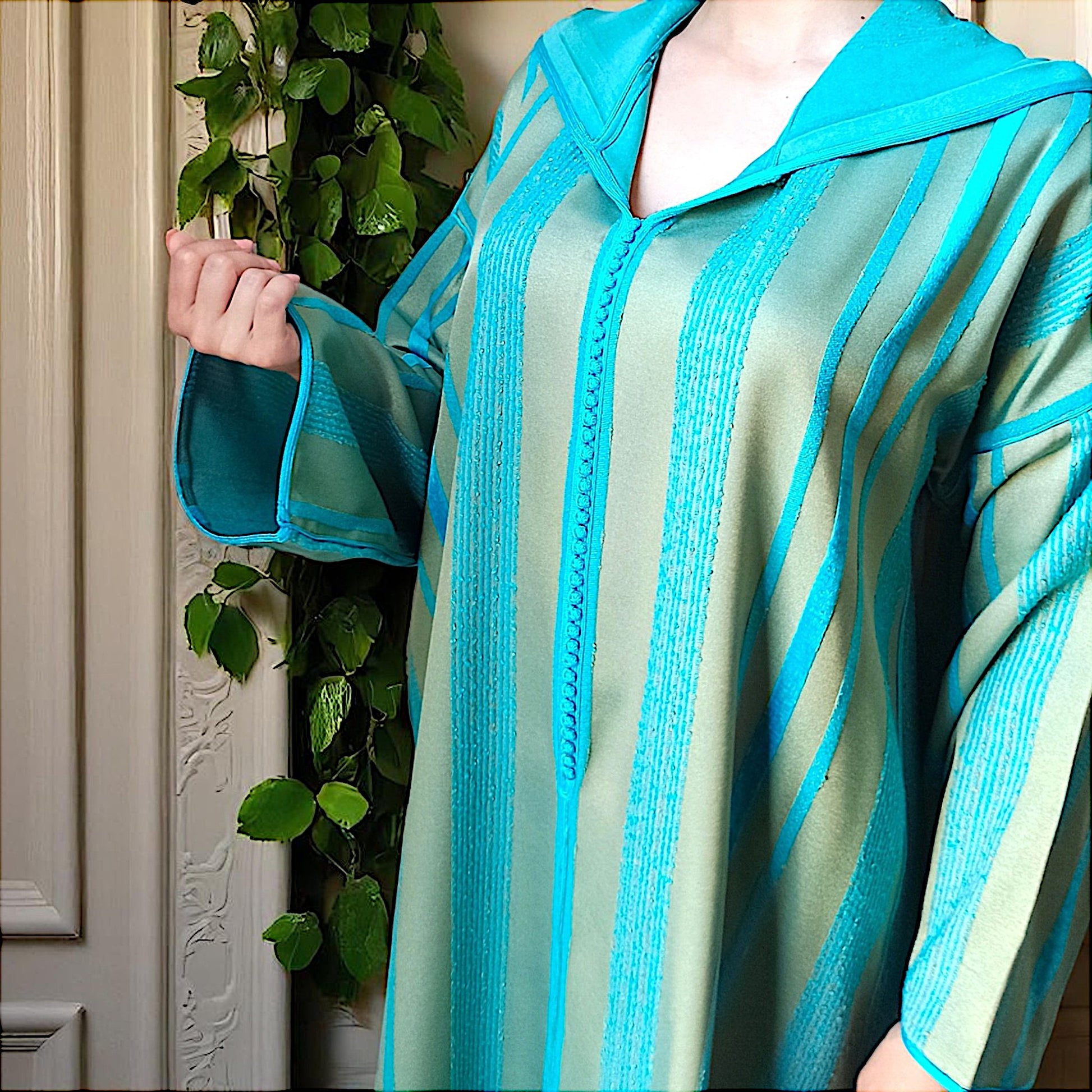 Order on WhatsAppVibrant turquoise hues flow through this refreshing djellaba, inspired by clear desert skies and coastal winds.