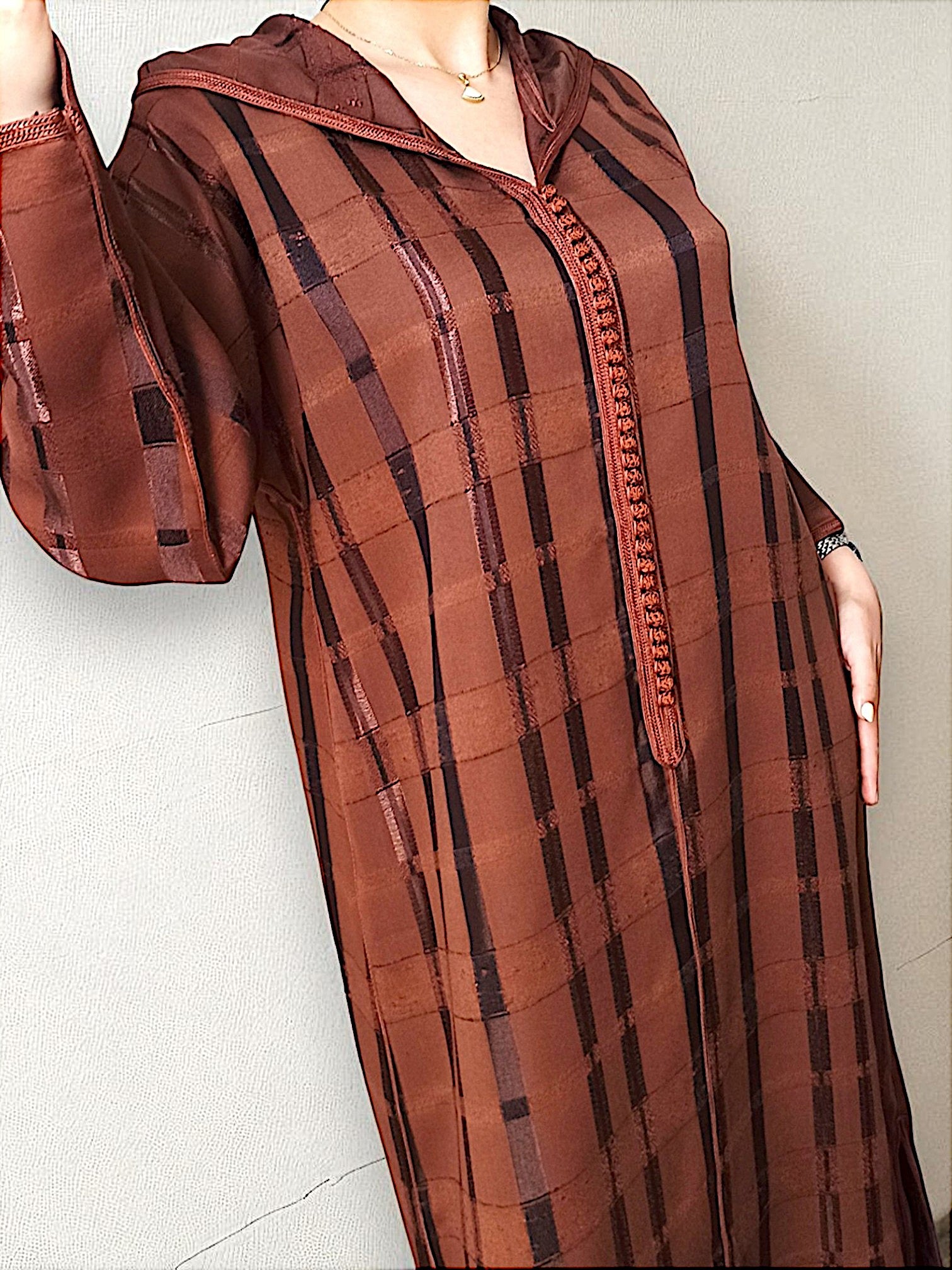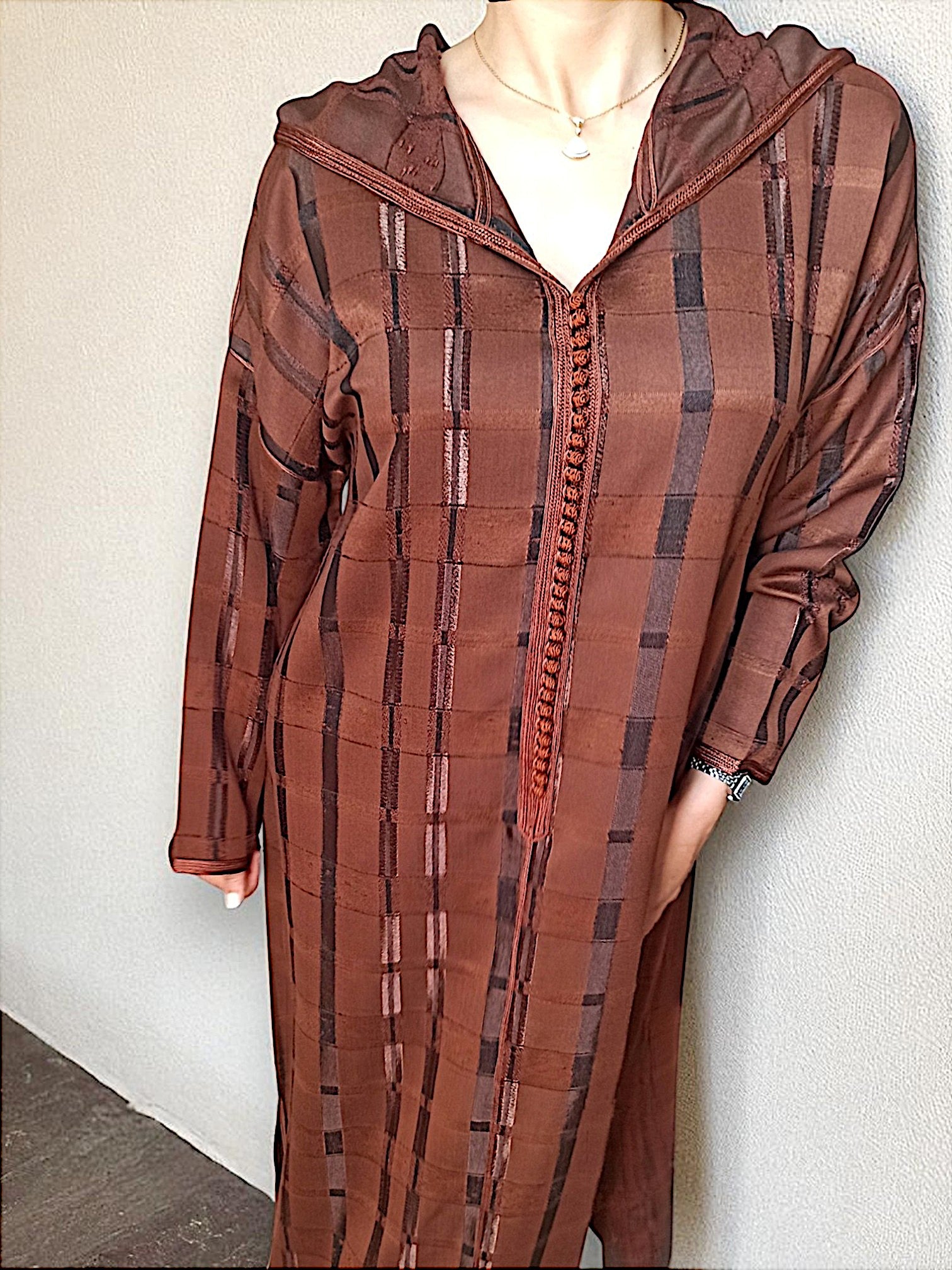 Order on WhatsAppEarthy and refined, this chocolate-hued djellaba weaves understated sophistication with artisanal charm. A timeless choice for lovers of natural tones and textured depth.