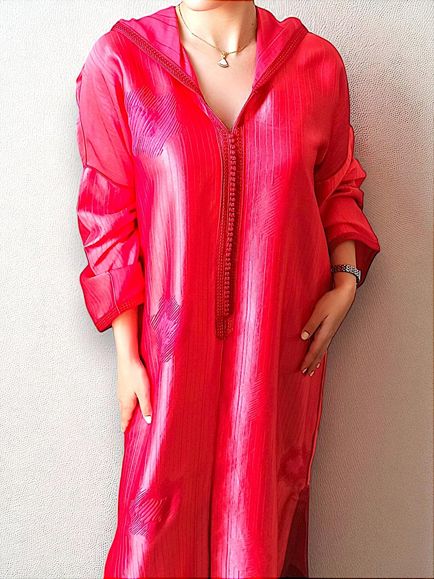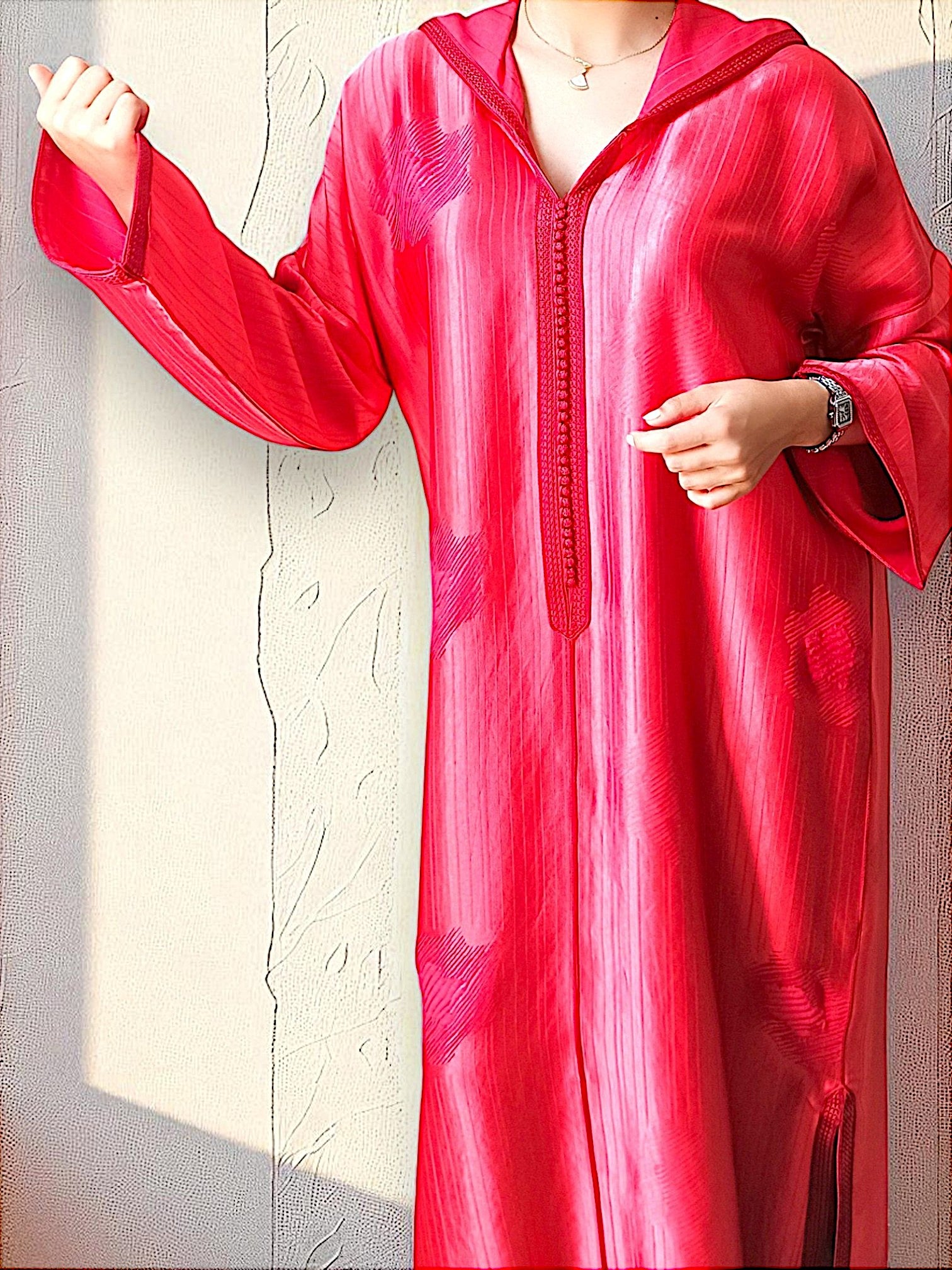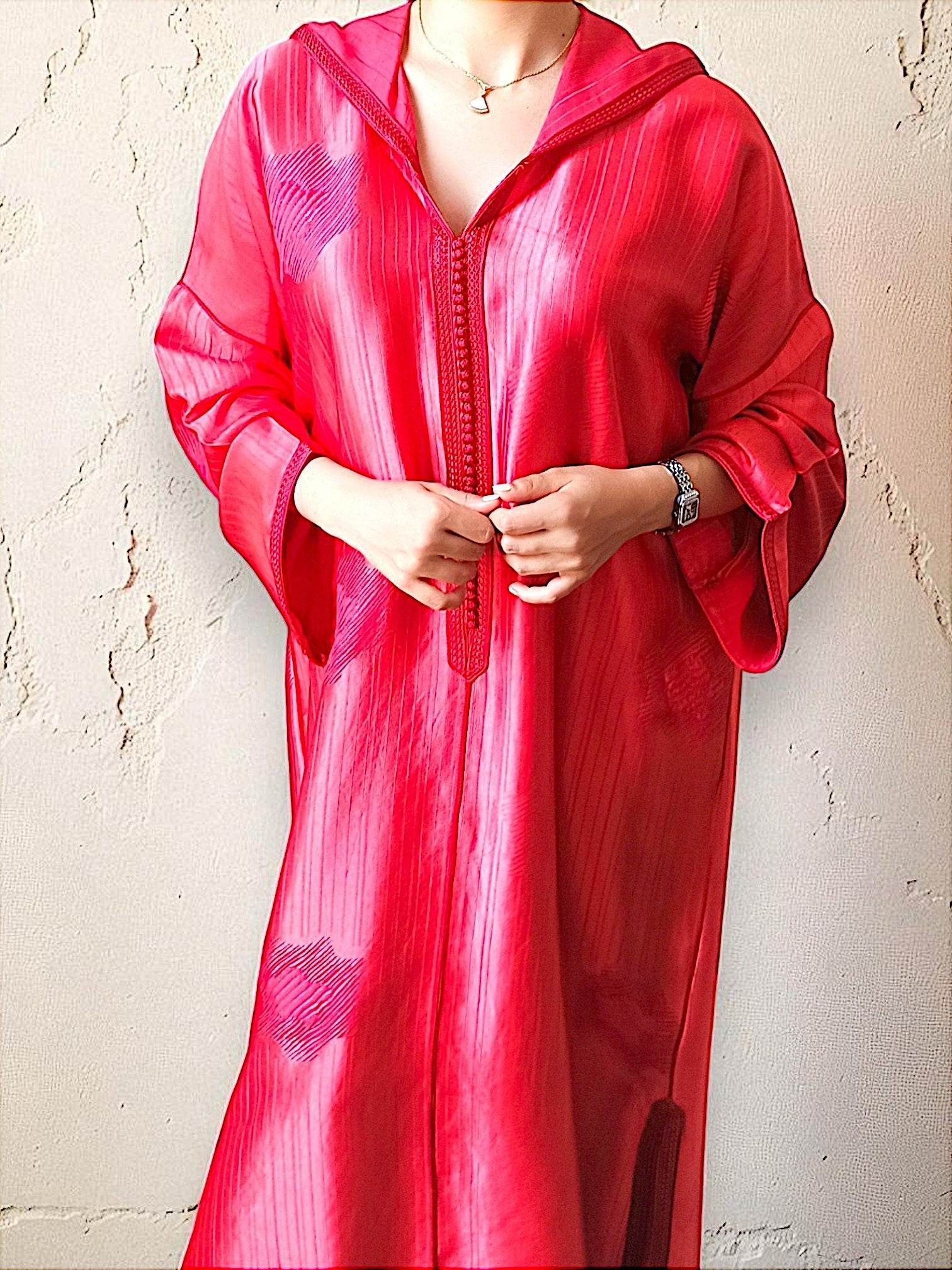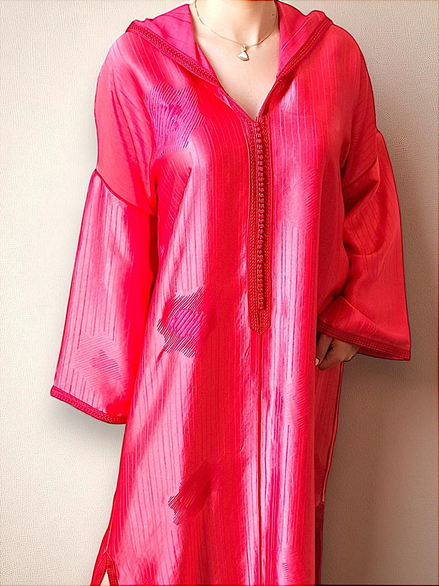 Order on WhatsAppWith its striking coral-red sheen and fluid silhouette, this luminous djellaba captures the passion of a desert bloom under the setting sun. A standout piece for bold, modern elegance.