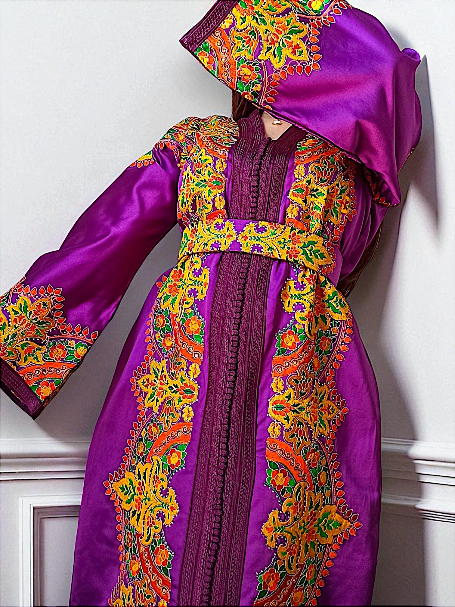 Order on WhatsAppA jewel-toned wonder in soft mauve, this caftan is embroidered with delicate multicolor threads that evoke quiet opulence. With subtle strass shimmer and a matching embroidered belt, it moves with the grace of royalty.