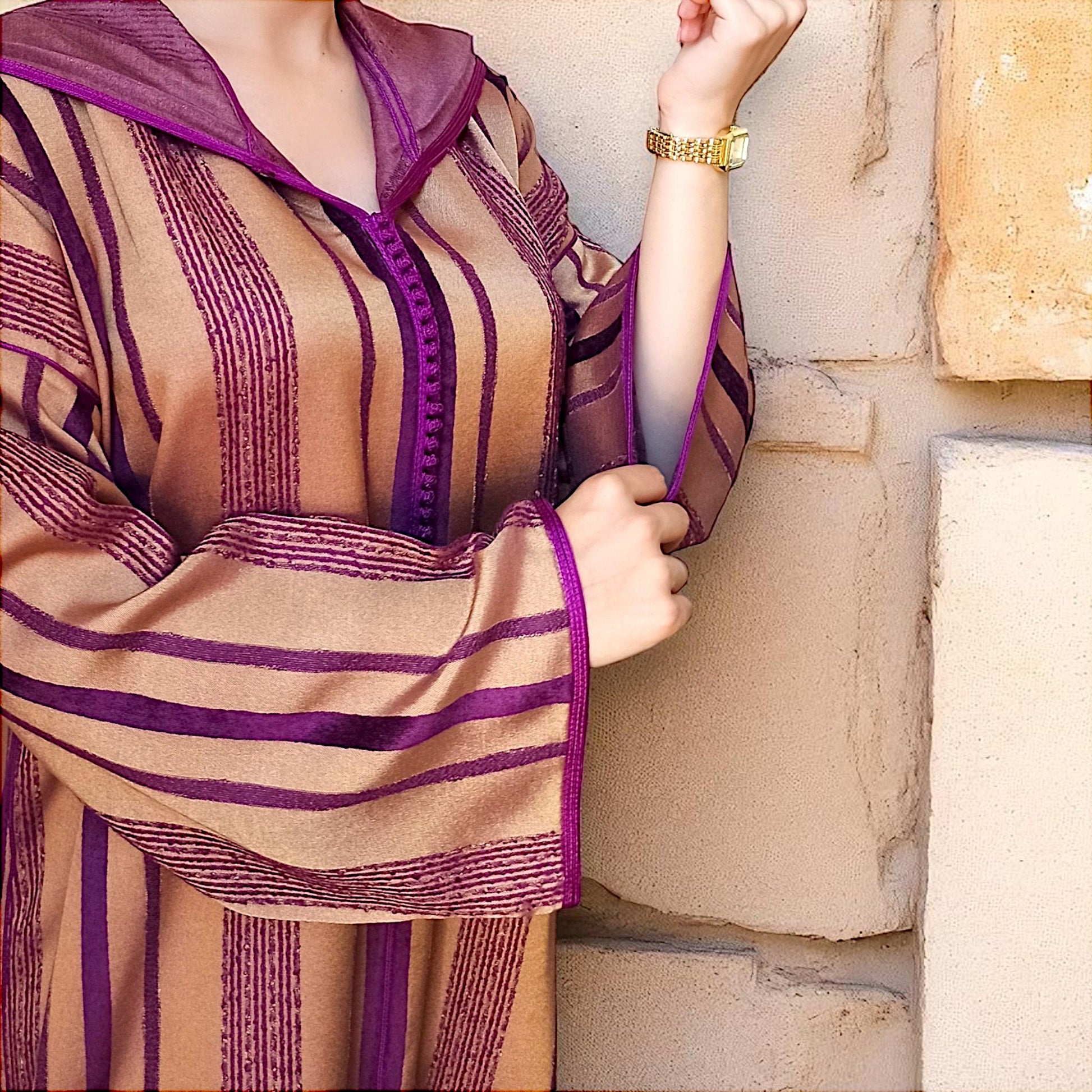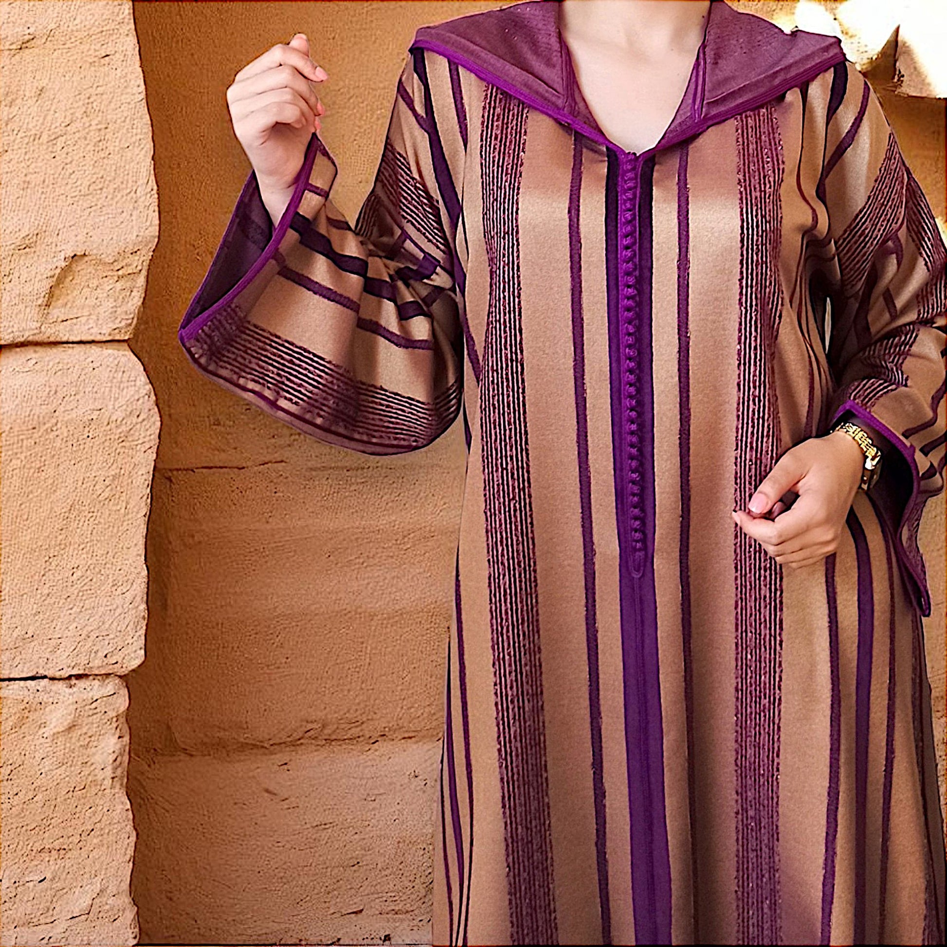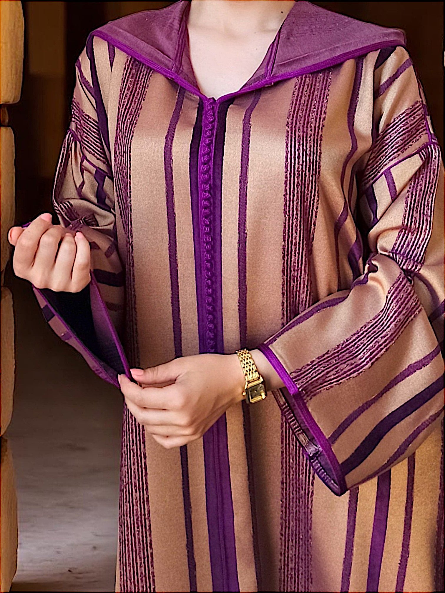 Order on WhatsAppA rich plum-striped djellaba that speaks of power and refinement. Its deep tone and soft silhouette evoke quiet royal confidence, perfect for evening elegance or serene daytime grace.